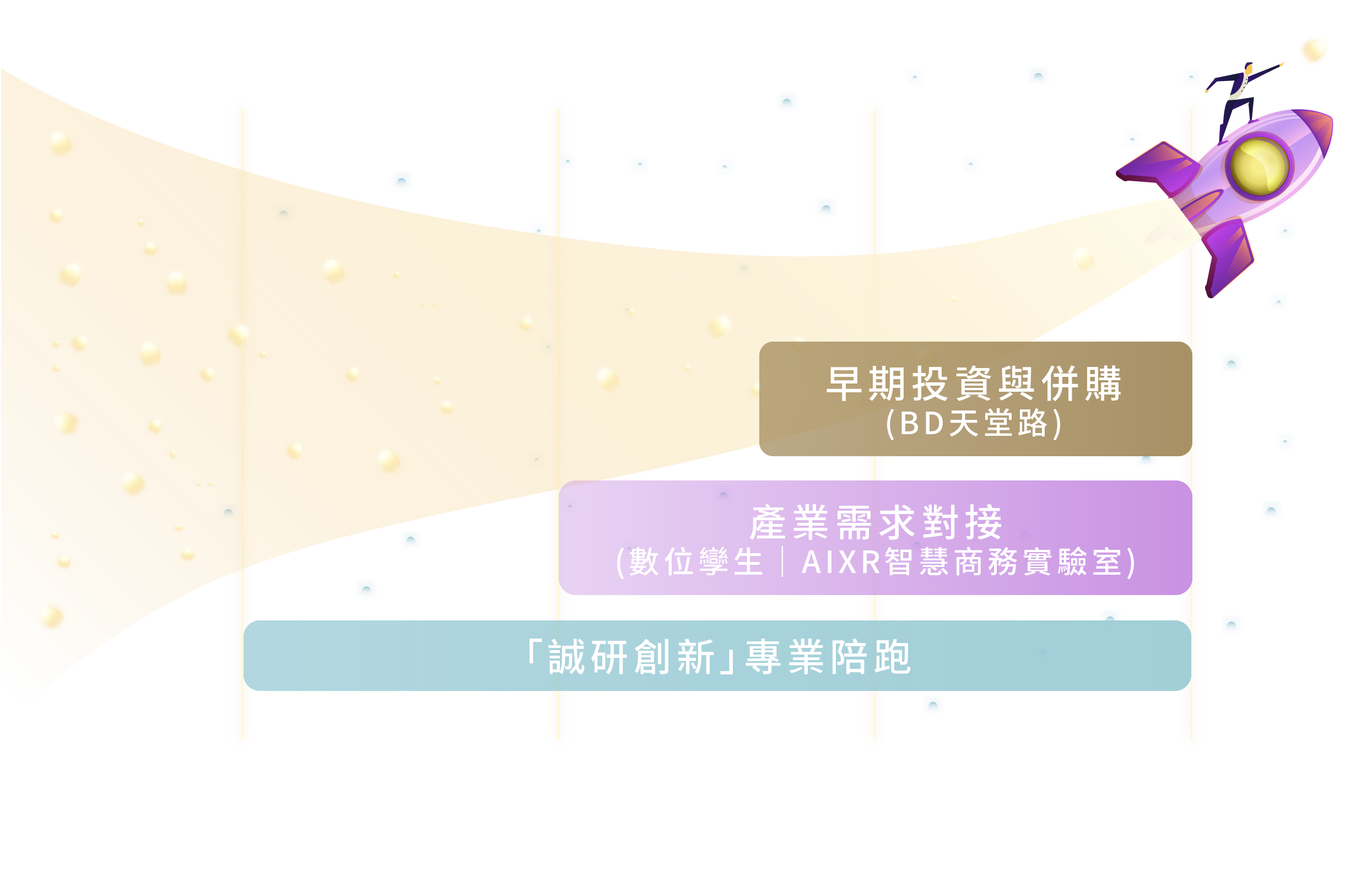 誠研創新專注於技術探勘、早期投資、商模驗證、引資加速以及企業策略轉型成長等五個階段搭接一個從早期到B輪之後(IPO或M&A前) 的產業化平台。為了達成上述五個階段的策略目標,我們將發展「創業孵化與企業發展」、「科技諮詢與數位轉型」以及「早期投資與戰略併購」三大核心業務。